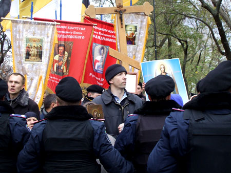 Только на ул. Трехсвятительской перед Михайловской площадью два-три десятка националэкстремистов попытались преградить движению колоне Крестного хода. Однако, задержка была не долгой и через 10-15минут благодаря быстрым и четким действиям ОМОНА, нарушители были посажены в автозаки и увезены в отделение милиции. Потом выяснилось, что задержанным было предъявлено обвинение в нарушении административного кодекса.