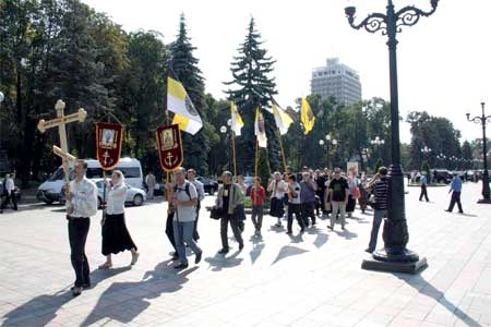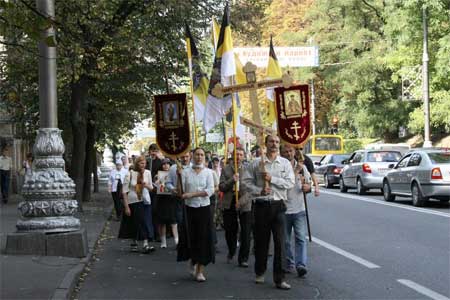 Крестоходцы прошли улицами Киева от Успенского собора Киево-Печерской лавры к Александро-Невскому храму. В настоящее время здесь на месте разрушенного храма богоборцами-коммунистами уже 5 лет стоит палаточный храм. Крестный ход община прихода во главе с о. Олегом встретила колокольным звоном. На протяжении всего маршрута православные молились, читали акафисты.