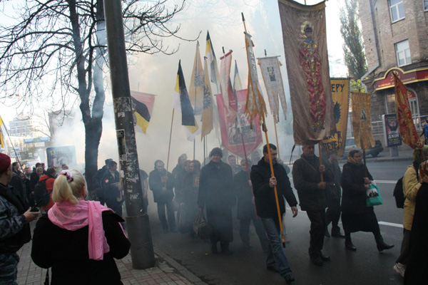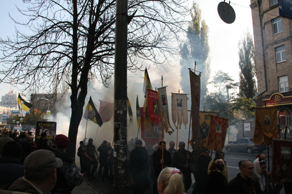 Когда участники шествия проходили мимо станции метро «Арсенальная», они подверглись новой атаке националистов – в русских активистов полетела дымовая шашка.