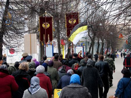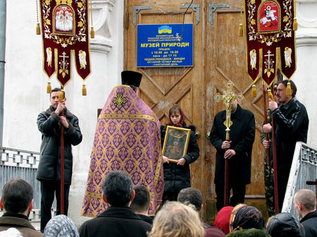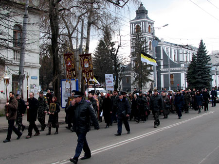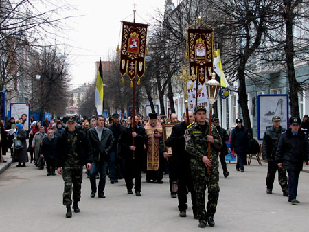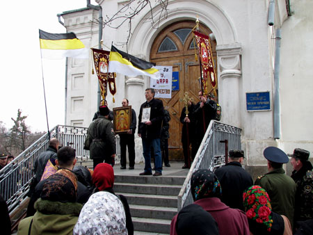 В день насильственного отрешения от Престола последнего российского императора Николая II и явления иконы Божией Матери "Державная", православные г.Житомира провели крестный ход, в котором также приняли участие члены Житомирского отдела Союза Русского Народа и казаки Полесского куреня Войска Запорожского. Под лозунгом "За Веру, Царя и Отечество", с черно-желто-белыми знаменами и иконами православные прошли по центральным улицам города к Свято-Крестовоздвиженскому храму, который до сего времени используется как музей природы. Уже более десяти лет власти города не могут (или не хотят) решить вопрос о передачи храма его законным хозяевам - православным канонической Церкви Московского Патриархата. На паперти храма был отслужен молебен перед иконой Божией Матери "Державная" об укреплении святой Церкви нашей Православной и соблюдении ее от неверия, раскола и ересей.
