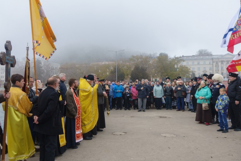 Отслуживъ литію о воинахъ, животъ свой положившихъ за Вѣру, Царя и Отечество, и прочтя молитву святому праведному Ѳеодору Ушакову у рядомъ стоящего бюста великому русскому флотоводцу, верущіе снова под звонъ колоколовъ прошли вдоль сквера Возсоединенія Крыма съ Россіей, черезъ городскую площадь у древняго собора къ набережной.